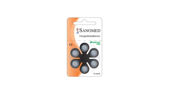 Die quecksilberfreien Hörgerätebatterien von Sanomed sind im 6er-Pack in den Größen 10, 13, 312 und 675 erhältlich mit jeweils 1,45 Volt. Zu beachten ist, dass diese Batterien nicht wiederaufladbar sind.