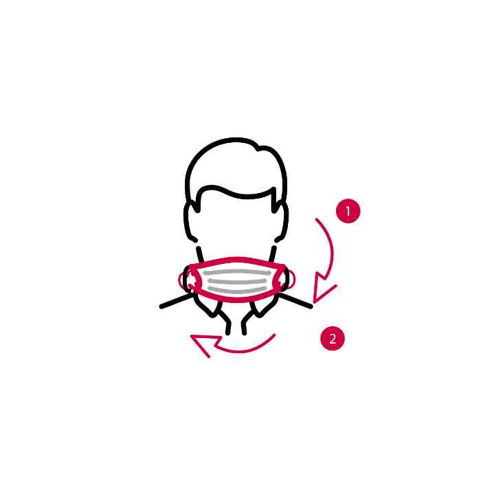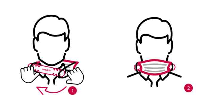 Mettre le masque sur le cou et enfiler l’élastique du deuxième côté devant votre visage puis tourner le masque vers l’avant.