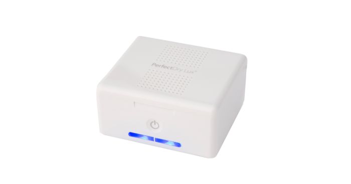Boîte sèche. Sur simple pression d'un bouton, l'humidité et l'eau condensée sont éliminées des aides auditives et la croissance des bactéries est arrêtée par la lumière UV.