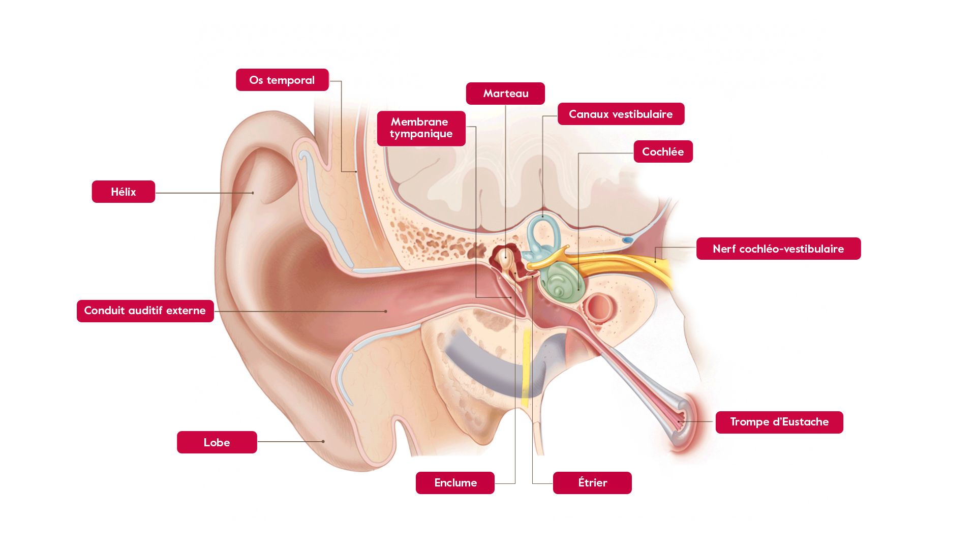 L’oreille moyenne contient trois osselets, le marteau, l’enclume et l’étrier, nommés pour leur ressemblance avec ces trois outils. Ces os sont les plus petits du corps humain, et leur fonction est de recevoir les ondes sonores, de les amplifier et de transmettre les sons au liquide contenu dans l’oreille interne.
