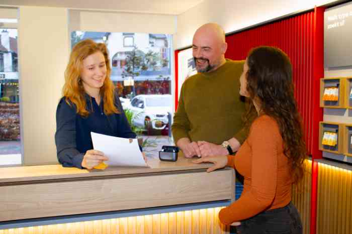 L'audiologiste d'Amplifon montre à une cliente comment porter correctement ses aides auditives.