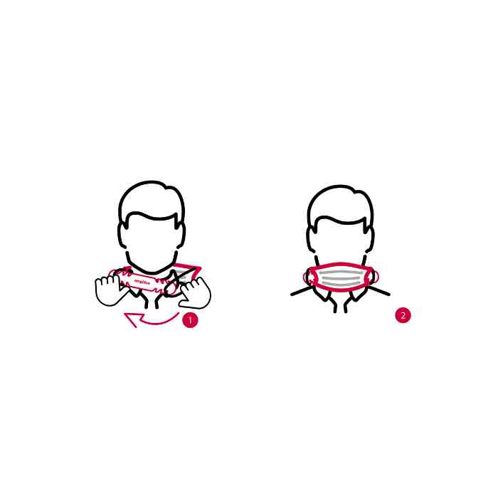 Étape 2 : Mettre le masque sur le cou et enfiler l’élastique du deuxième côté devant votre visage puis tourner le masque vers l’avant.