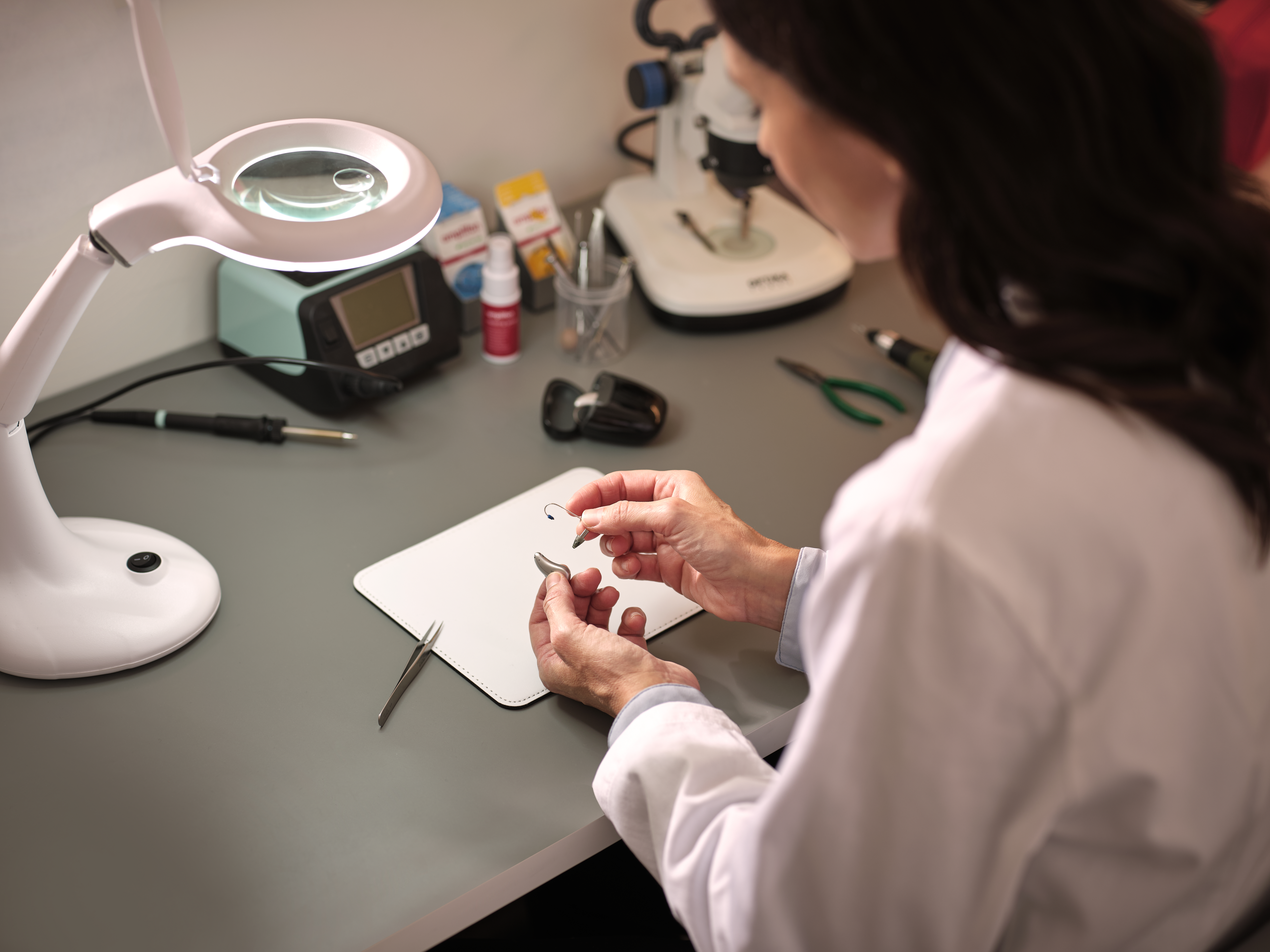 audiologo in laboratorio che lavora su un apparecchio acustico, indossando un camice.